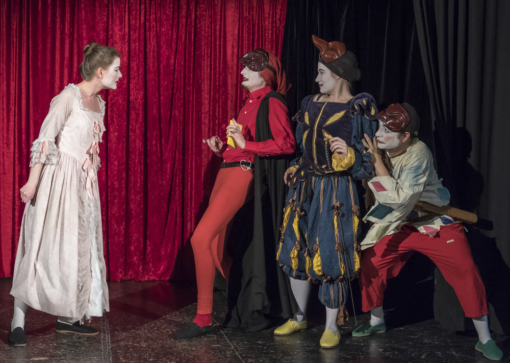 Commedia dell'arte ist eine Maskentheaterform, die Bewegung, Text und Körperarbeit kombiniert.